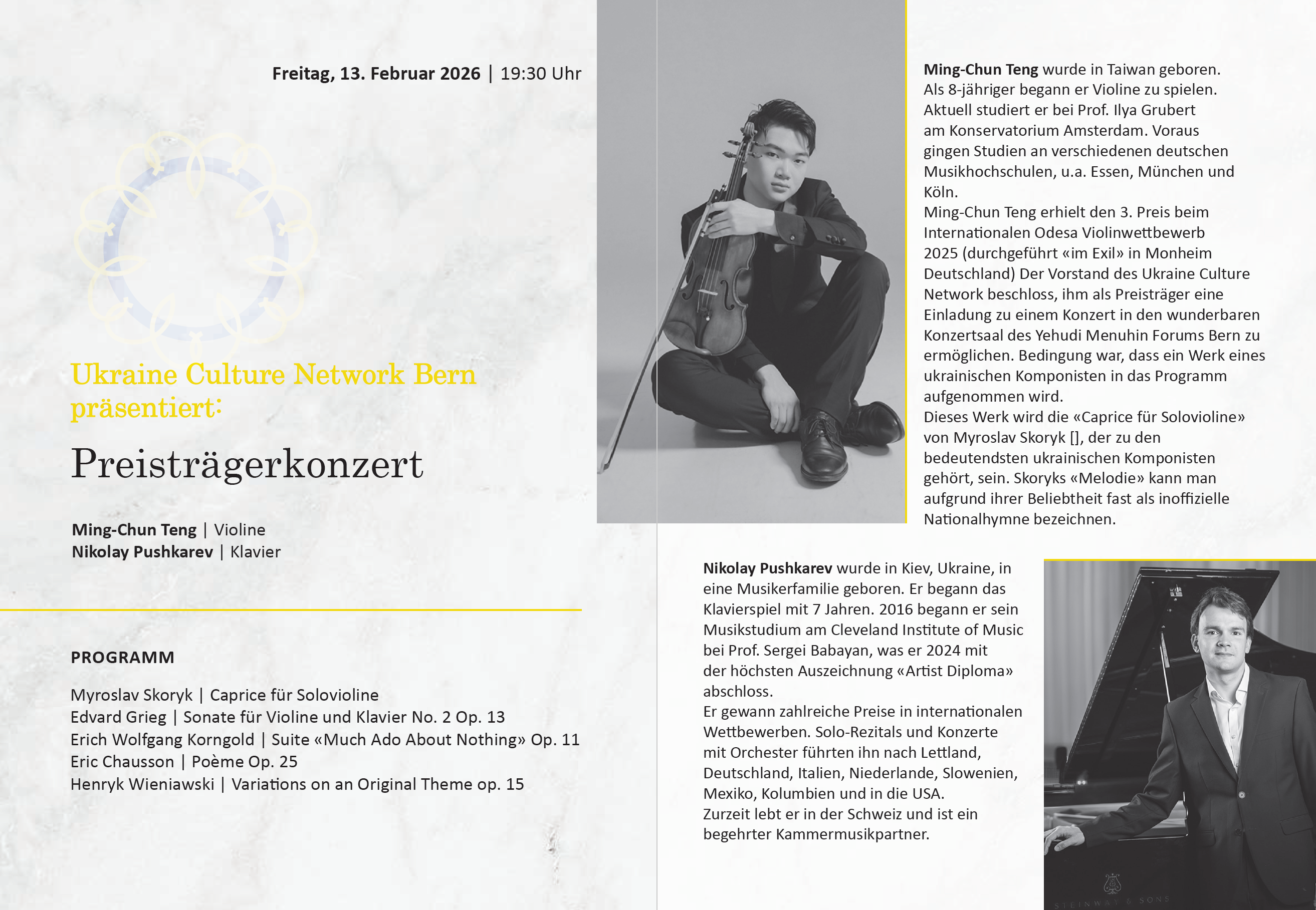 On Friday, February 13, 2026, violinist Ming-Chung Teng (Taiwan) will give a concert at Yehudi Menuhin Forum in Bern (19.30). He will be accompanied by Ukrainian pianist Nikolay Pushkarev.